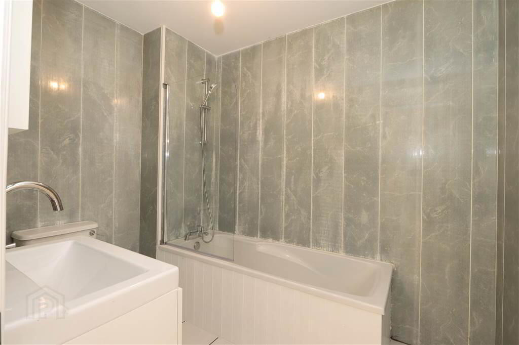 BATHROOM: 8’0” x 6’6”. White suite comprising panelled bath with mixer tap and shower