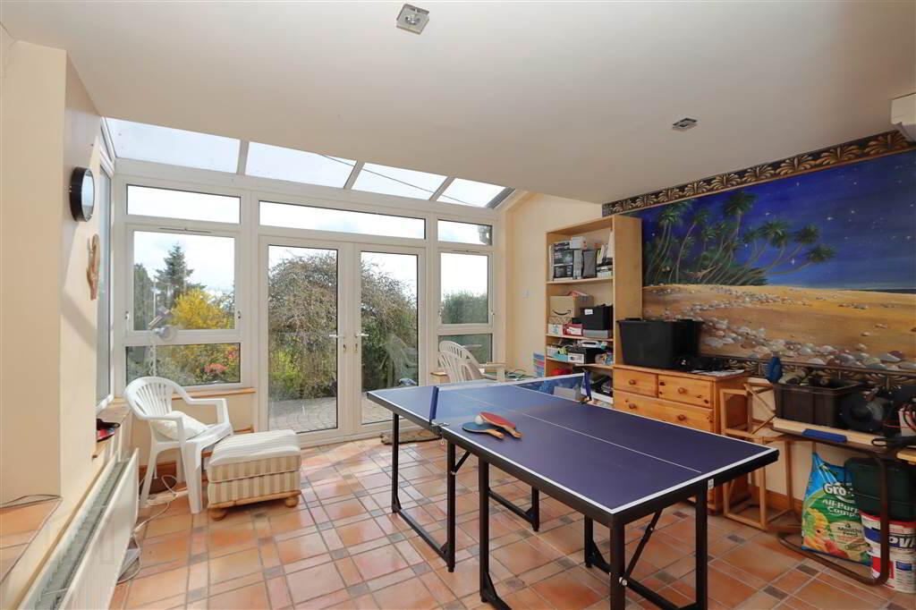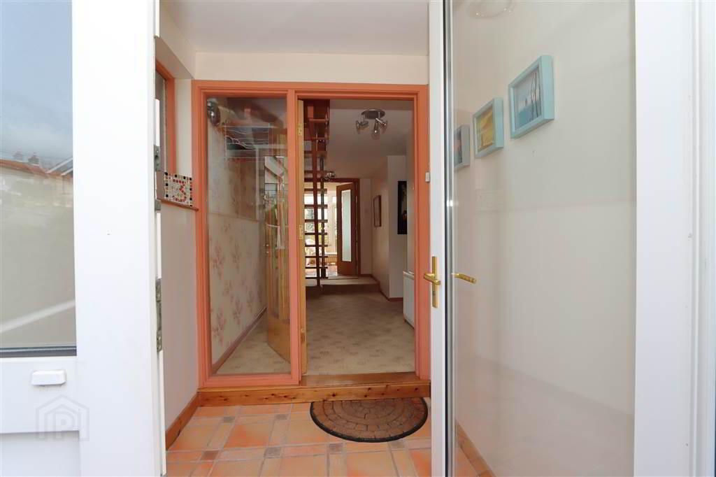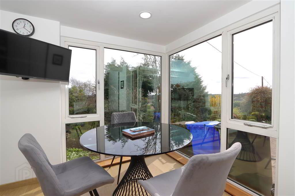 SUNROOM/ PLAYROOM: 13’2” x 11’9”. Ceramic tiled floor. French doors to garden and patio, separate double glazed door from lounge. White PVC double glazed extension, recessed spotlights, Lough Views. Frosted glass double doors to hallway.