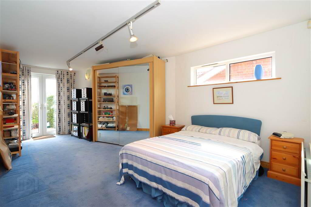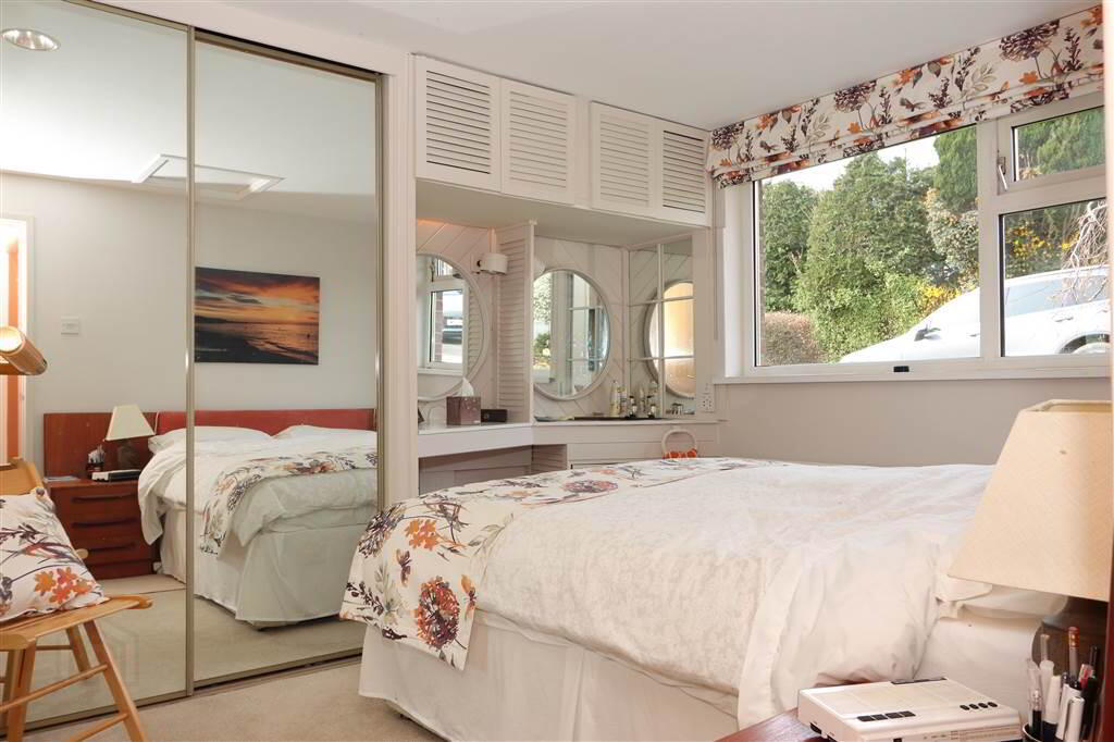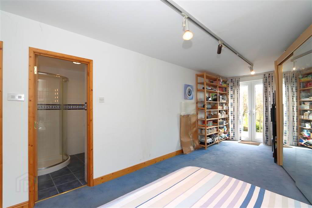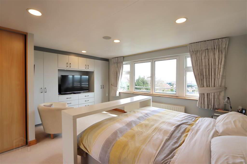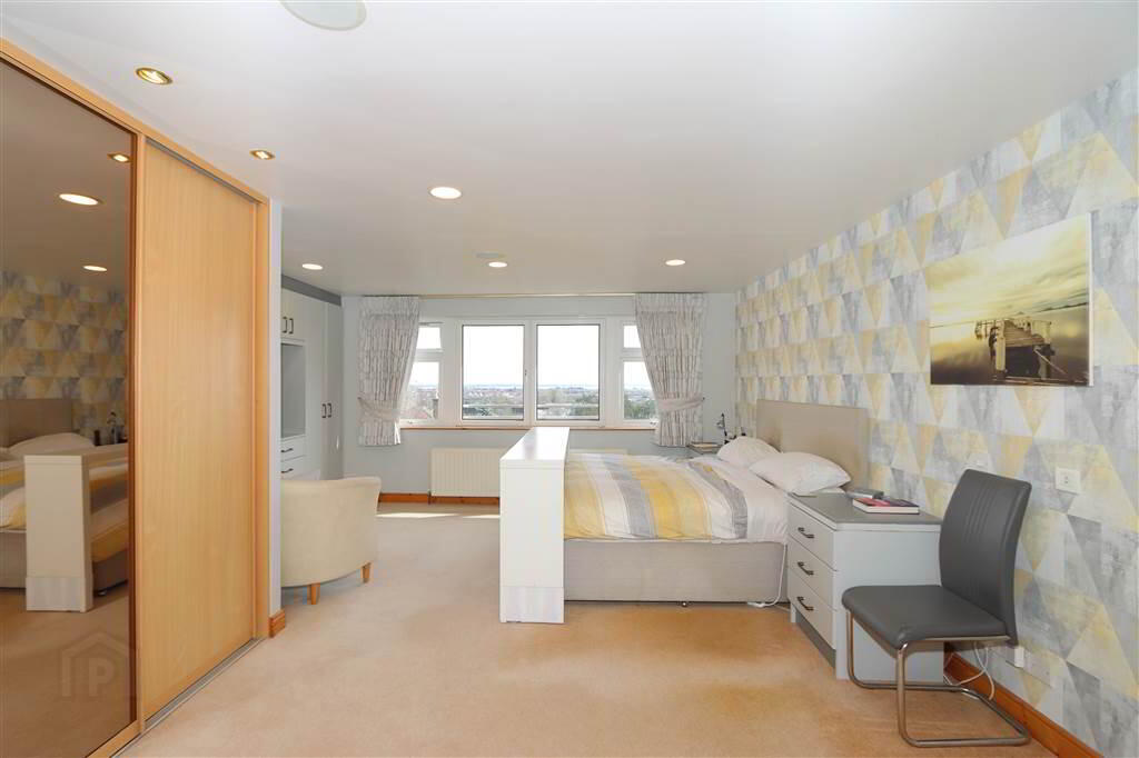 MASTER BEDROOM SUITE: 20’9” x 16’6” including built-in wardrobes, slide robes and drawers. Recessed spotlights, wired for sound with recessed ceiling speakers, separate built-in partly mirrored wardrobe. Large picture window with stunning views towards the Lough.