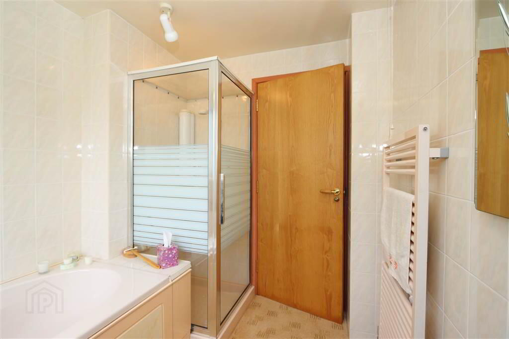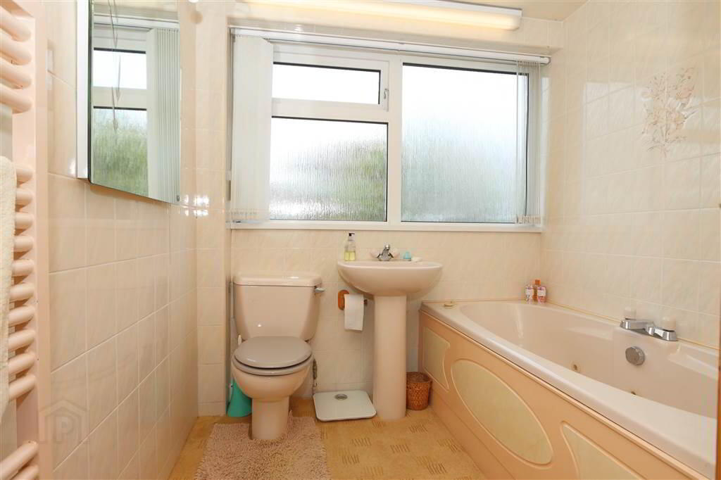 GROUND FLOOR BATHROOM: 8’1” x 6’7”. Cream suite comprising of a Jacuzzi style panel bath, central mixer tap, pedestal wash hand basin, low flush WC, shower cubicle with Aqualisa shower. Heated towel radiator. Mirror.