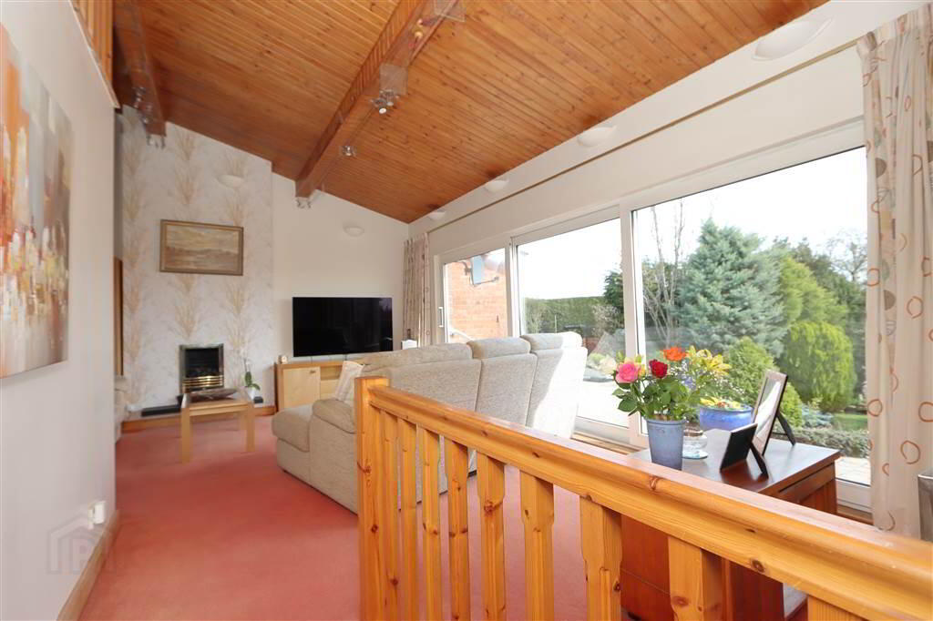 The property comprises three generous double bedrooms, two with ensuite facilities. The impressive first-floor principal suite is a standout feature, enjoying breath-taking elevated views. The bright and airy lounge boasts a striking pine vaulted ceiling, sliding patio doors, and a delightful outlook over the mature gardens towards the Lough.