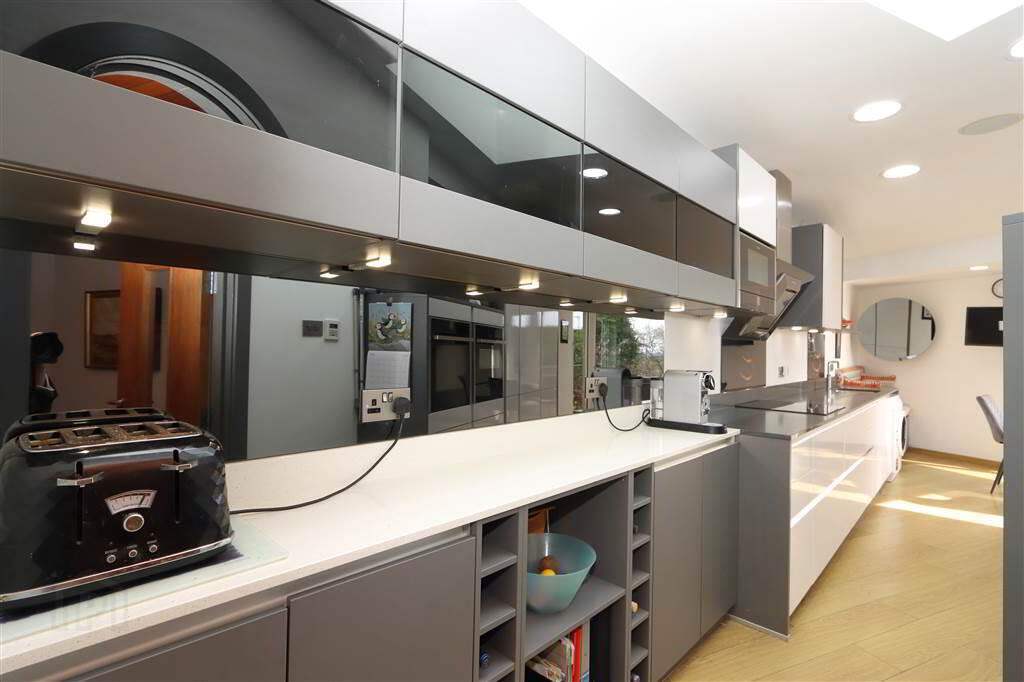 KITCHEN & CASUAL DINING AREA: 27’1” x 12’4” (at widest point). Modern sleek grey & white fitted units with granite work tops, mirrored glass splash back, Neff 4 ring ceramic hob, glass and stainless extractor fan, Neff Microwave, oven and grill, double glazed roof light, recessed spotlights, plumbed for washing machine, inset 1 ½ tub sink and drainer unit with Quooker boil tap. Integrated Smeg dishwasher, integrated tall fridge and separate freezer. White PVC double glazed floor –to –ceiling corner window. Bench seat, store cupboard with light. Wired for sound, recessed ceiling speakers, recessed spotlights. Wood laminate floor.