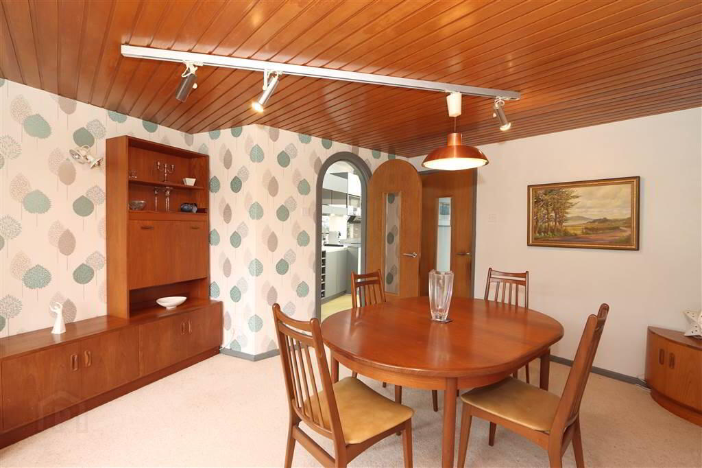 DINING ROOM: 14’5” (max) x 12’6”. Tongue and groove pine ceiling, Arch door to kitchen.