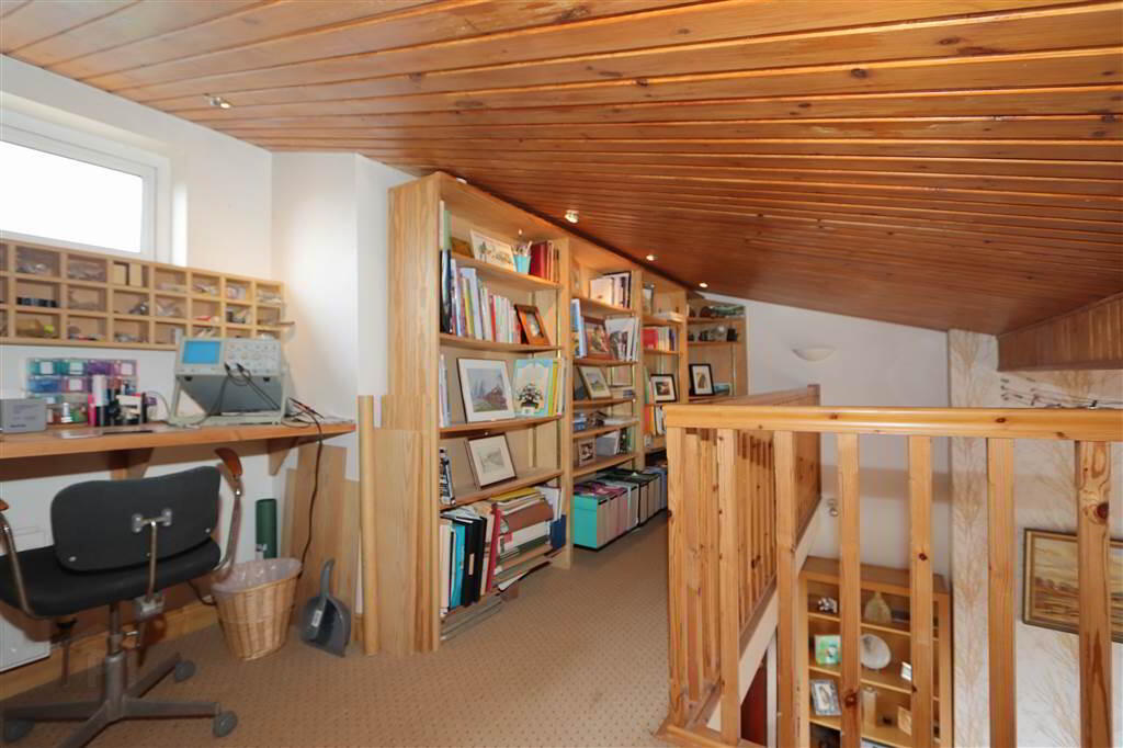 GALLERIED LANDING: 21’5” (max) x 9’6”. Pine tongue and groove ceiling, recessed spotlights, Library/ study area.