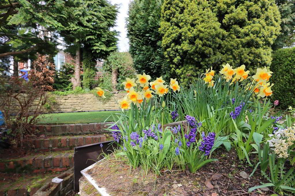 GARDENS: Mature, extensively planted front garden with lawn and evergreen and seasonal flowering shrubs and trees. Brick paved driveway.