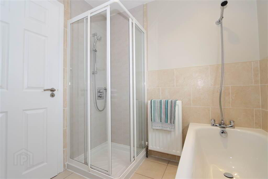 BATHROOM: 7’5” x 6’8”. White suite comprising of panel bath with mixer taps and shower hose extension, shower cubicle with Trevi thermostatic shower, PVC wall tiling in shower, pedestal wash hand basin, low flush WC, partly tiled walls, extractor fan, recessed low voltage spotlight, ceramic tiled floor.