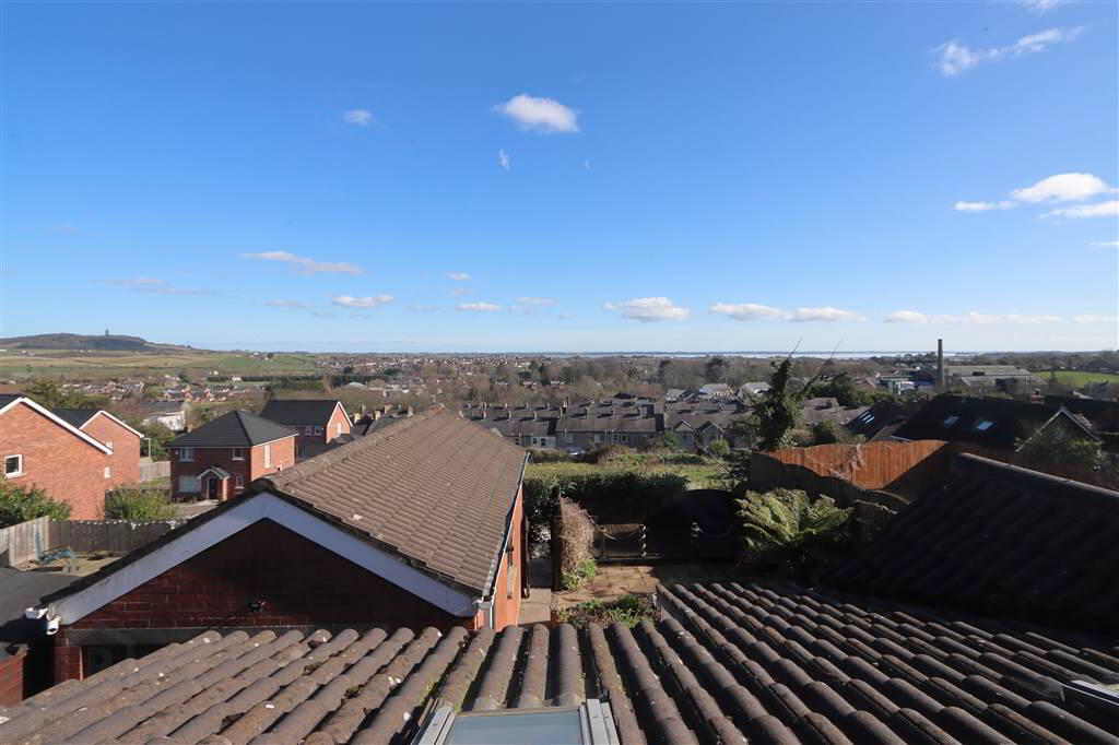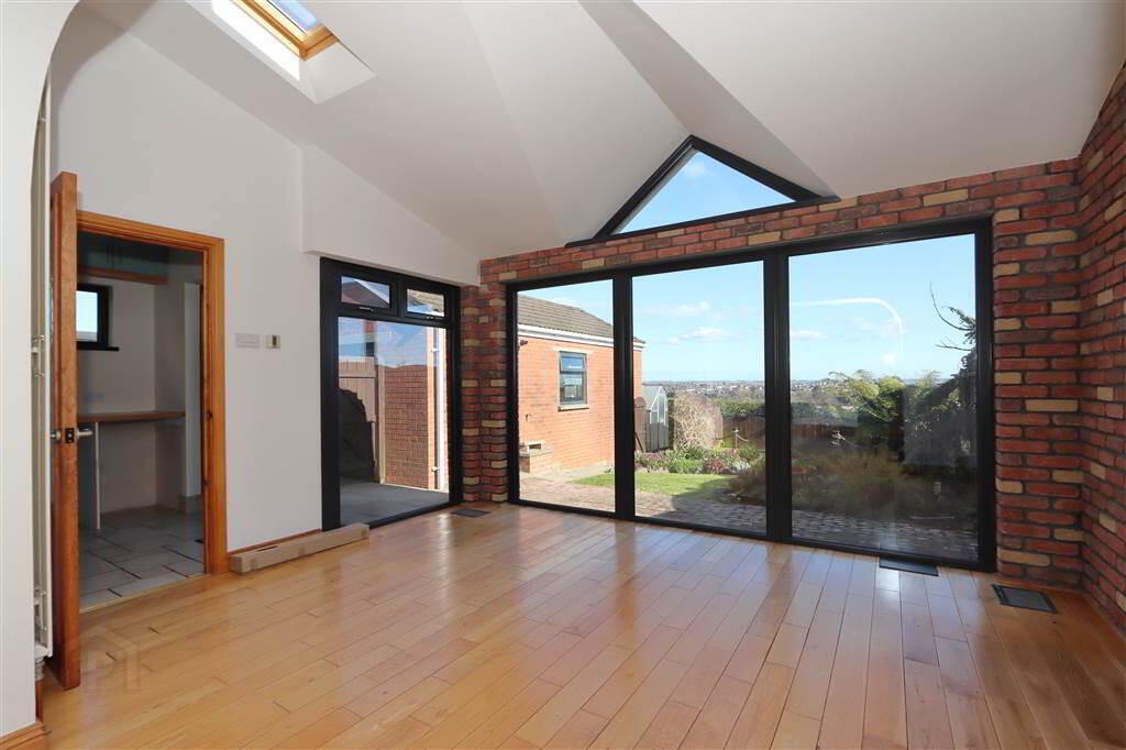 Internally, this excellent family home offers well-presented and flexible accommodation comprising three well-proportioned first floor bedrooms and a modern family bathroom. On the lower level there is a useful study/lobby area, a bright living room with solid oak flooring and an attractive fireplace, and a stunning sunroom featuring a vaulted ceiling and floor-to-ceiling triple-glazed windows that perfectly frame the impressive views. The superb kitchen, open plan to the dining area, benefits from a comprehensive range of fitted high and low level units, with a separate utility area incorporating sliding French doors leading to the rear garden.