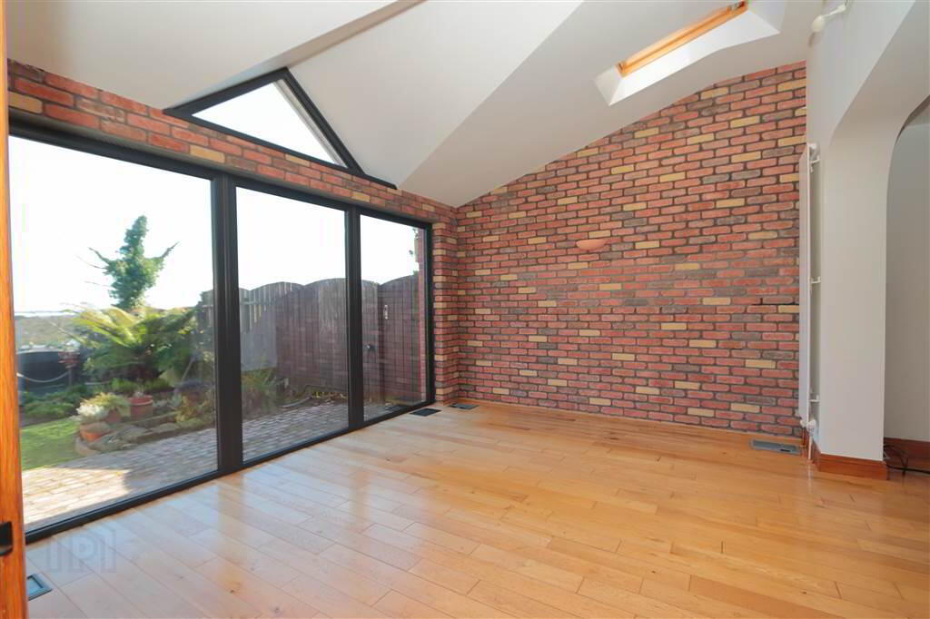 SUNROOM: 14’3” x 11’9”. Vaulted ceiling, red brick detailing, contemporary wall mounted radiators, wall lights, solid Oak floor, recessed floor mounted 13amp and 5 amp plug sockets, 3 large triple glazed floor-to- ceiling windows with stunning views. Velux windows, glazed door to: