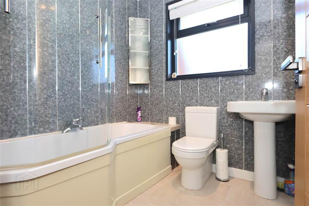 BATHROOM: 6’6” x 6’5”. Modern white suite comprising of a shower bath, glass shower screen, central mixer taps, Mira Sports electric shower unit, fully panelled walls, tongue & groove white PVC ceiling, dual flush close coupled wc, pedestal wash hand basin with monolever mixer tap, corner cabinet, wall mounted mirror, heated chrome towel radiator, laminate tiled floor.