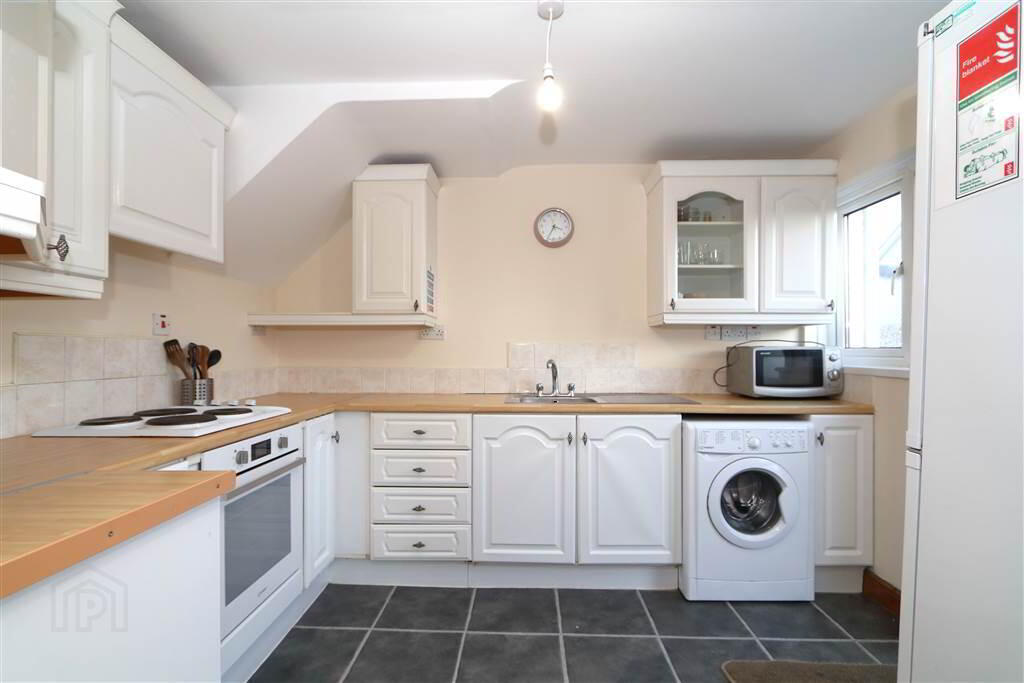 The kitchen is fitted with a range of white high and low level units and provides practical workspace and storage. The first-floor bathroom is fitted with a three-piece white suite, including a corner bath with electric shower.