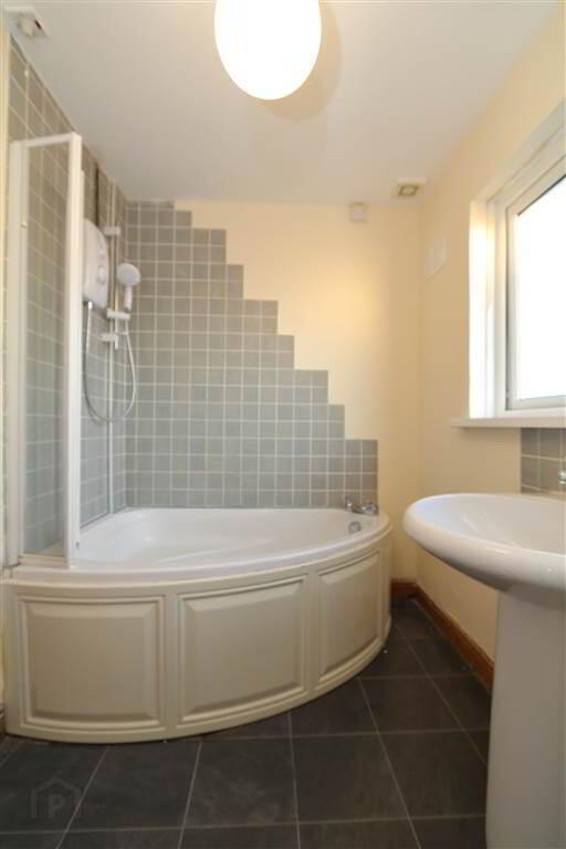 BATHROOM: 9’3” x 5’7”. White suite comprising corner panel bath with retractable shower screen, Mira electric shower, low flush WC, pedestal wash hand basin, tiled splash areas, wall mirror, extractor fan and laminate tiled flooring.