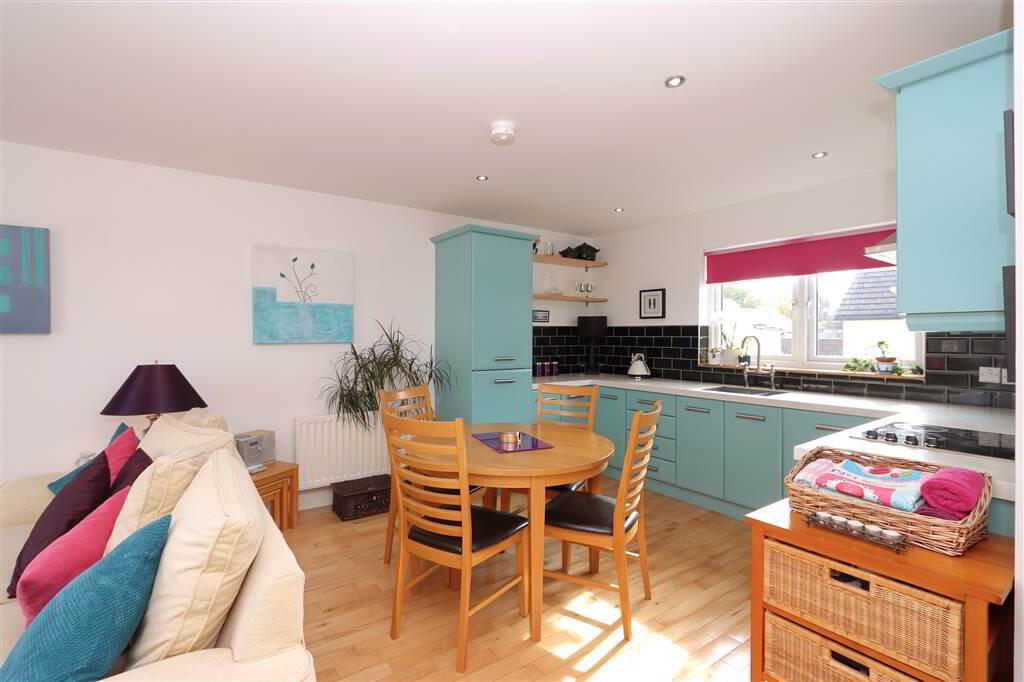 LOUNGE / KITCHEN & DINING: 20’9” x 15’9” (max. measurements). Excellent range of high and low level fitted units with laminate work tops, inset resin sink unit with mixer taps, 4 ring ceramic hob, stainless steel cooker hood with extractor fan and light, Smeg Oven, integrated fridge /freezer, Beko integrated dishwasher, partly tiled walls, recessed low voltage spotlights, open reach access point, TV aerial point. Solid Oak wood floor.