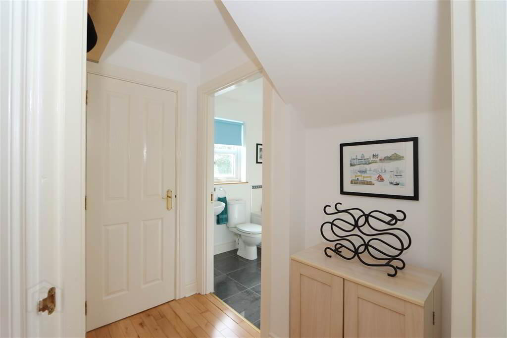 ENTRANCE HALL: 13’10” x 9’10” including staircase. Solid Oak wood floor, under stairs cupboard, galleried landing.
