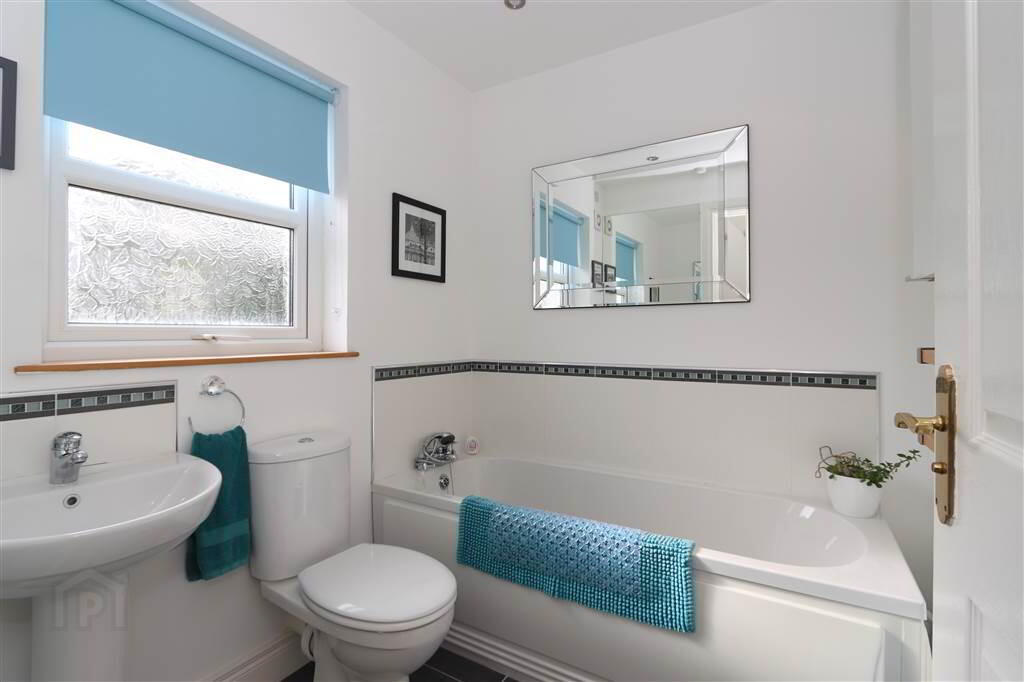 BATHROOM: 6’6” x 6’1”. Attractive white suite comprising of a panel bath with mixer tap and shower hose extension, dual flush close coupled wc, pedestal wash hand basin, tiled splash back, tiled around the bath, recessed low voltage spotlights, wall mounted mirror, extractor fan, ceramic tiled floor.