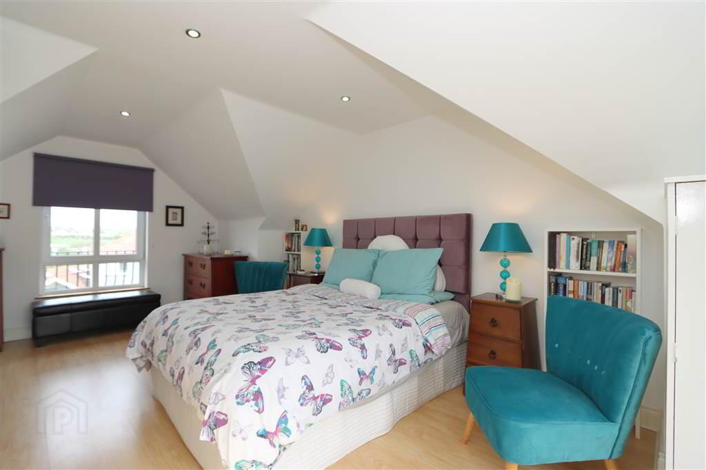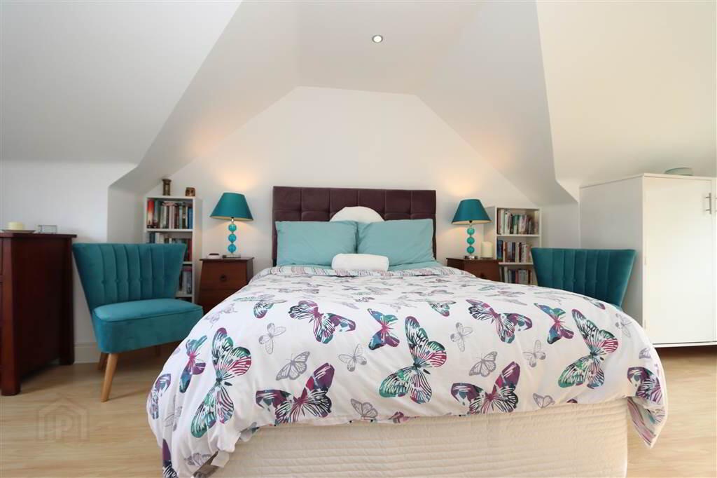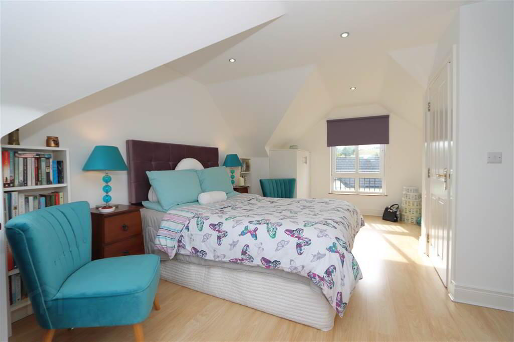 BEDROOM: 20’8” x 11 6”. Wood laminate flooring, recessed spotlights, eaves storage.