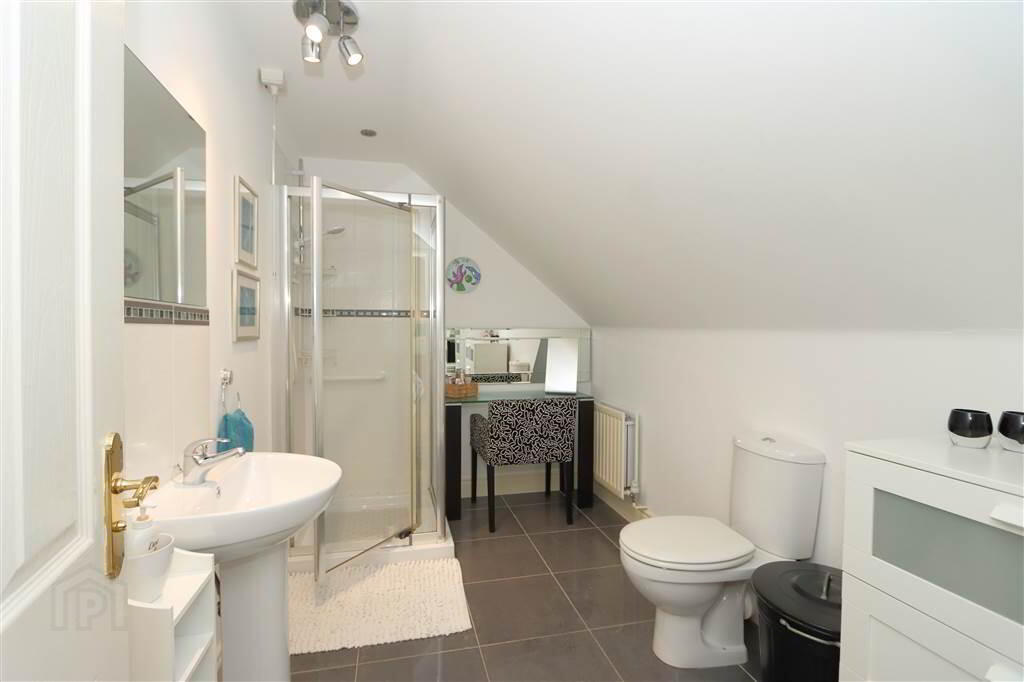 ENSUITE SHOWER ROOM: 10’7” x 6’8”. White suite comprising of fully tiled shower cubicle, electric shower unit, pedestal wash hand basin, low flush wc, extractor fan, mirror, ceramic tiled floor.